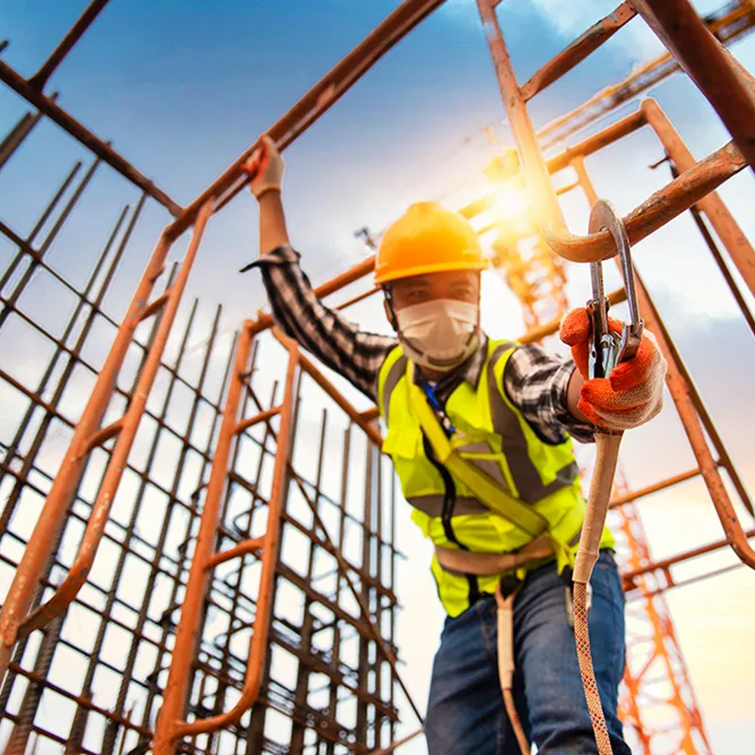 4) La persona encargada de realizar el montaje, debe subir hasta la altura en la cual se instalará la luminaria, este debe asegurarse con el equipo de protección personal contra caídas (cinturón, arnés y faja de seguridad) dando uso al sistema de anclaje.